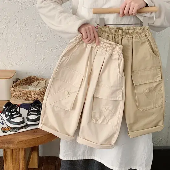 Quần trẻ em cotton kiểu cargo, thun ở eo, gấu cuộn (màu be)
