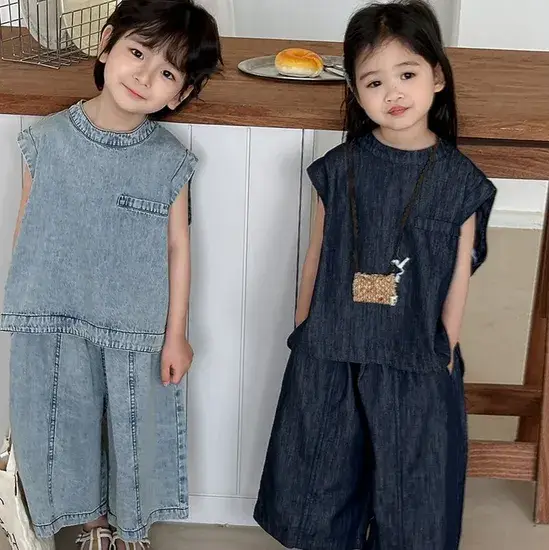 Bộ đồ trẻ em cho bé gái: áo denim kết hợp váy thời trang lý tưởng cho ngày hè và thu ngoài trời