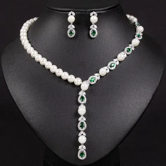 Bộ trang sức ngọc trai bao gồm vòng cổ và bông tai tinh tế, mang phong cách châu Âu và Mỹ với chi tiết kim cương và zirconia lấp lánh