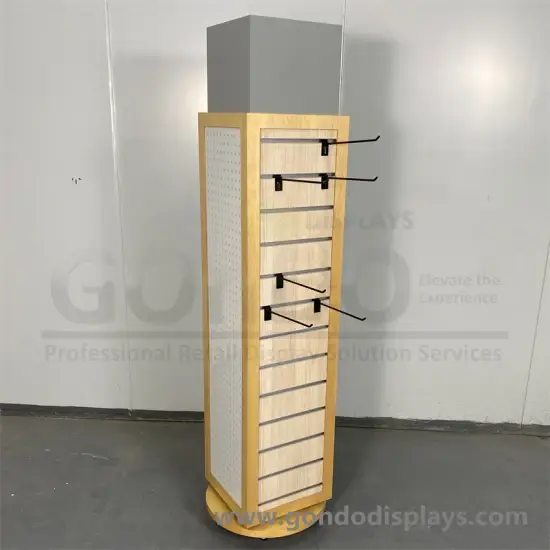Kệ trưng bày kính mát bằng gỗ nhựa đa năng, có gương và móc treo, lý tưởng cho quảng bá bán lẻ